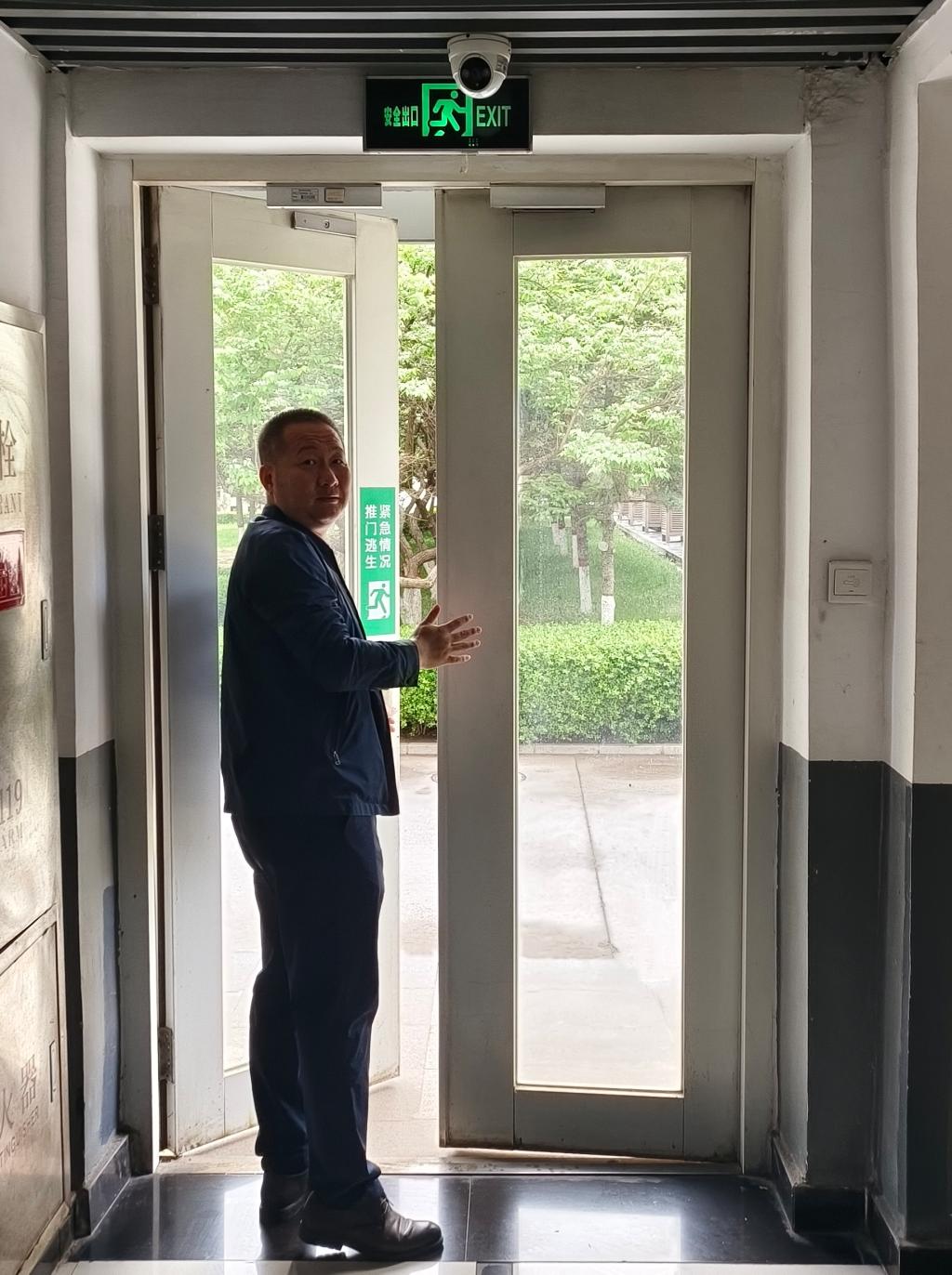 检查人员查看学生公寓疏散通道