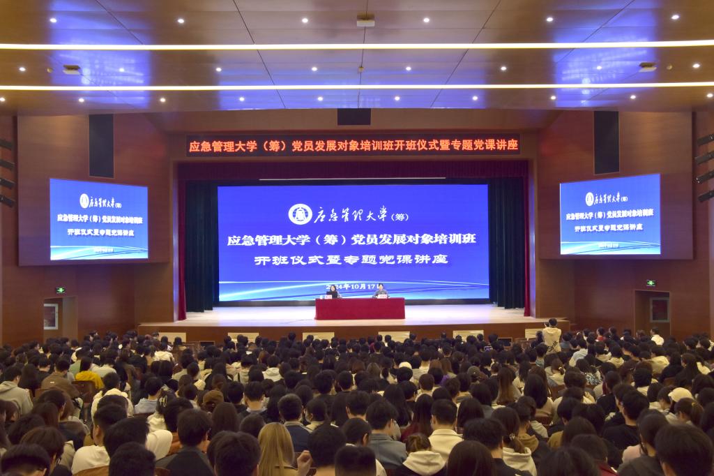 10月17日下午,应急管理大学(筹)2024年下半年党员发展对象培训班正式开班。学校邀请中央党校新时代中国特色社会主义教研室主任、博士生导师董洁教授作专题辅导报告,370名党员发展对象和402名中共预备党员参加开班式。