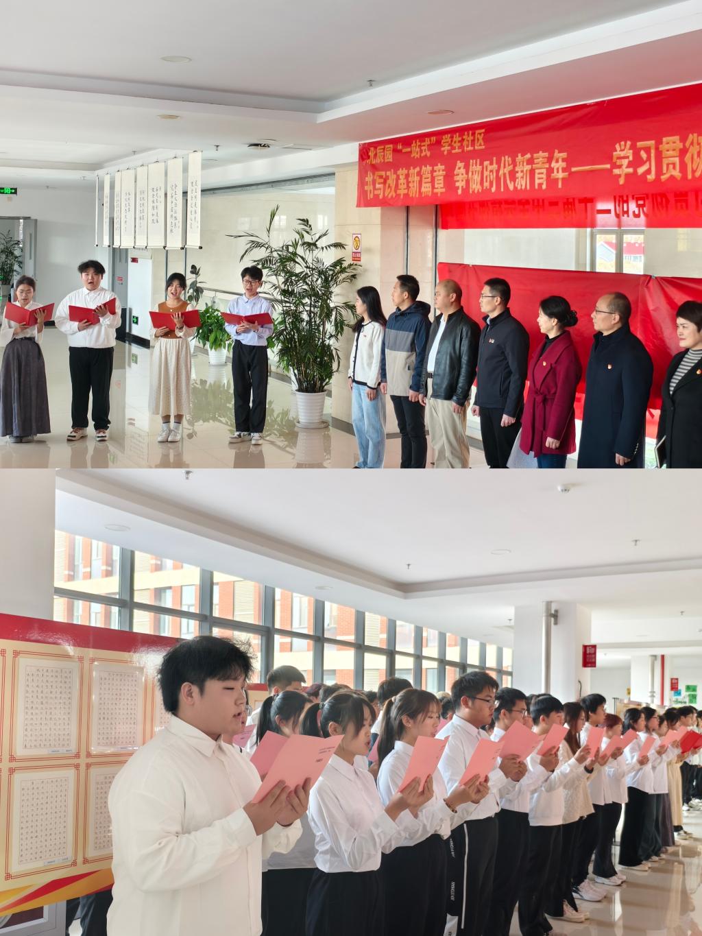 王翼涵、刘培涛、杨烯未、张嘉依等四位学生代表朗诵了《梦想照耀中国》,刘思彤、张鑫等50名同学集体朗诵了《中共中央关于进一步全面深化改革、推进中国式现代化的决定》中关于教育综合改革篇章。电子科学与控制工程学院党总支书记贾甚杰介绍了书画展的组织开展情况。