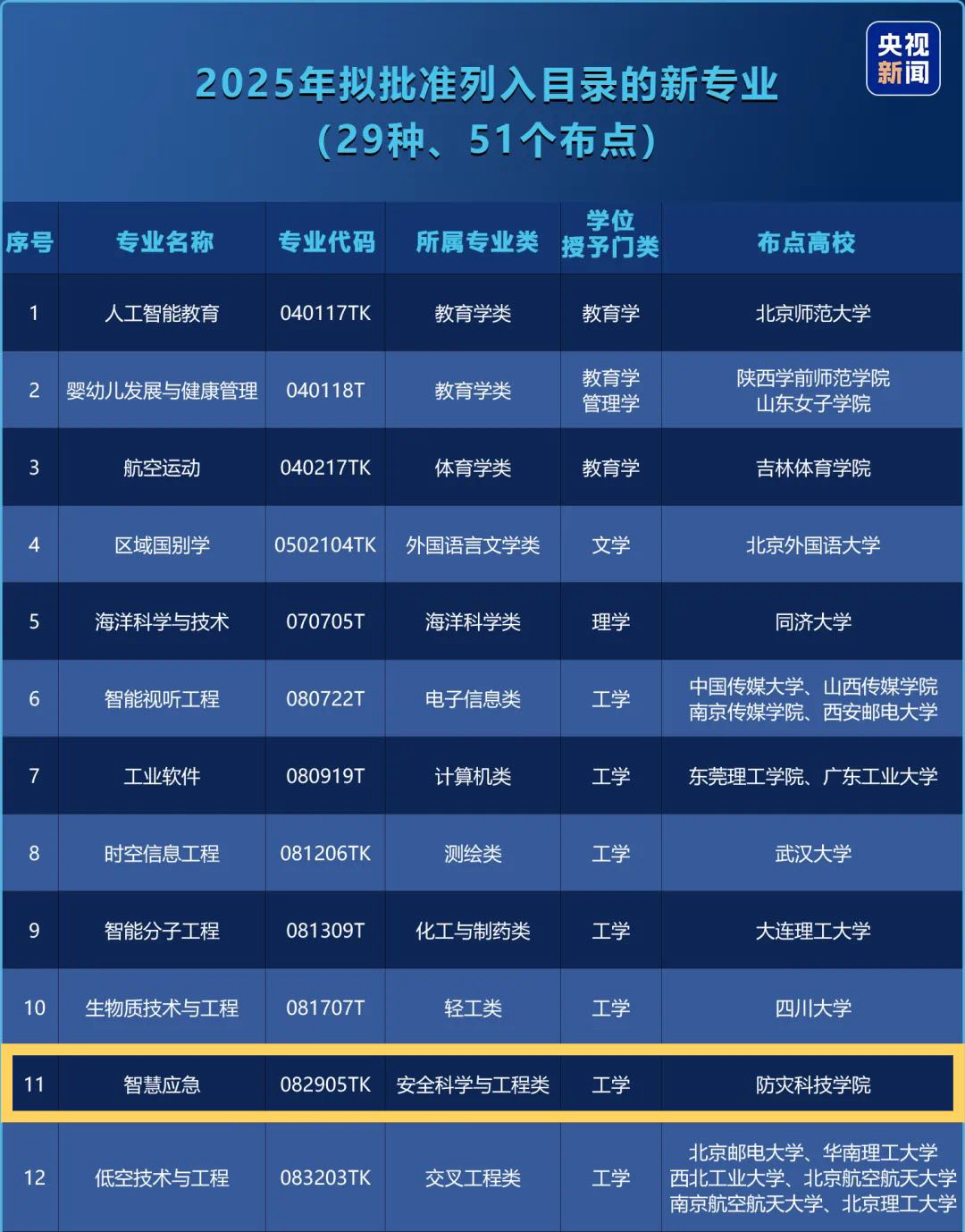 教育部4月22日正式发布《普通高等学校本科专业目录(2025年)》,本次共有172所高校申报了101个新专业,其中51所高校申报的29个新专业成功获批。beat365应急技术与管理学院申报的智慧应急专业(专业代码:082905TK)通过审批,成为全国首个设立该本科专业的高等院校,标志着我国应急管理学科建设迈入智能化发展新阶段。