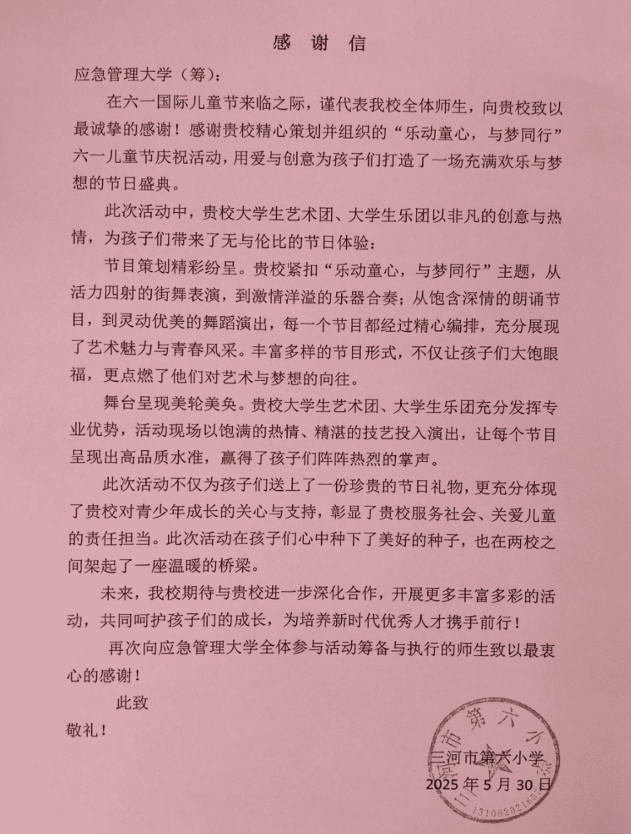 编者按:5月29日上午,应急管理大学(筹)大学生艺术团、乐团走进三河市第六小学开展“乐动童心,与梦同行”的文艺演出实践活动。通过艺术进小学校园活动,不仅促进了大学生与小学生之间的交流与互动,培养孩子们的艺术素养和审美能力,有助于形成积极向上的校园文化氛围,还极大地锻炼了他们的演出技能和团队协作能力,提升了他们的艺术实践能力和社会责任感。此次大学生艺术实践志愿活动得到六小师生的诚挚的邀请和学校领导的大力支持。演出反响热烈,获得了六小师生一致好评。