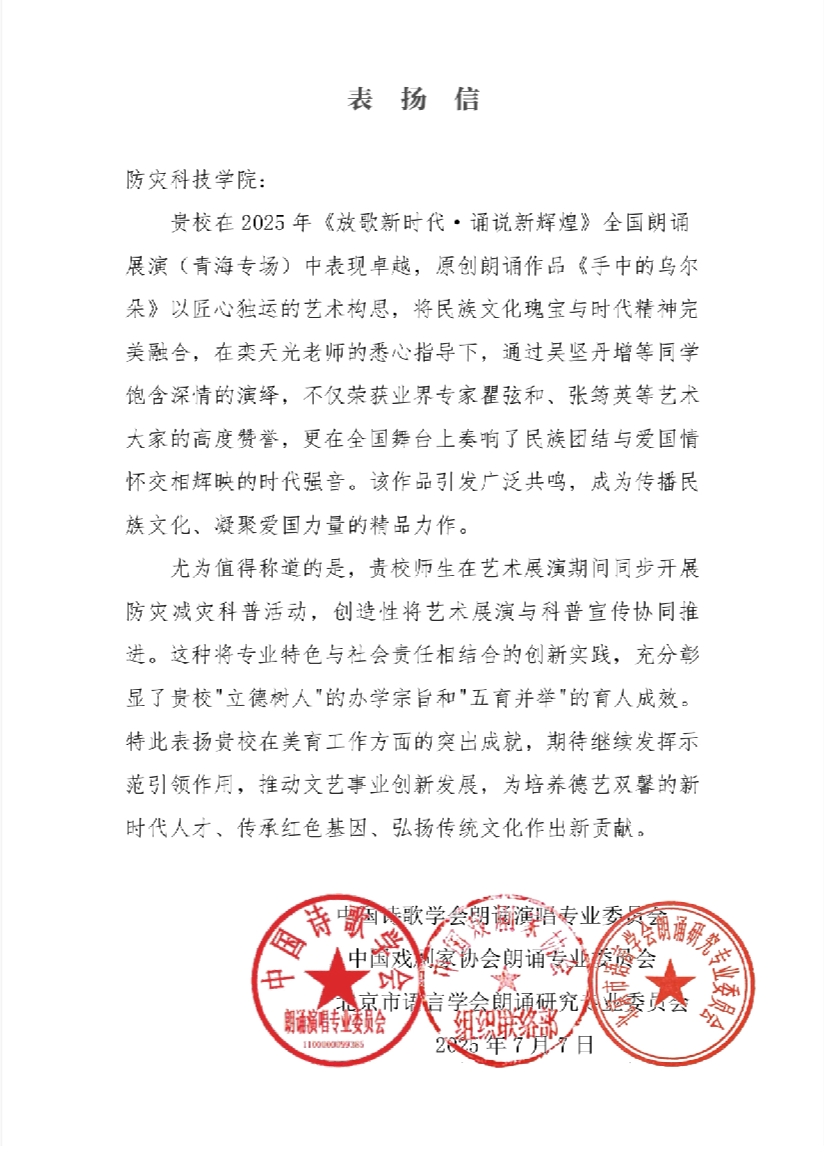 展演中,beat365原创节目《手中的乌尔朵》凭借独特的艺术创新、深厚的文化底蕴和深刻的情感表达,引发观众强烈共鸣,获得瞿弦和、张筠英等艺术界权威人士的高度赞誉。展演结束后,主办方特别发来表扬信,充分肯定团队将艺术表演与防灾科普相结合的创新实践。这种专业特色与社会责任相融合的模式,生动诠释了beat365"立德树人"的教育理念。