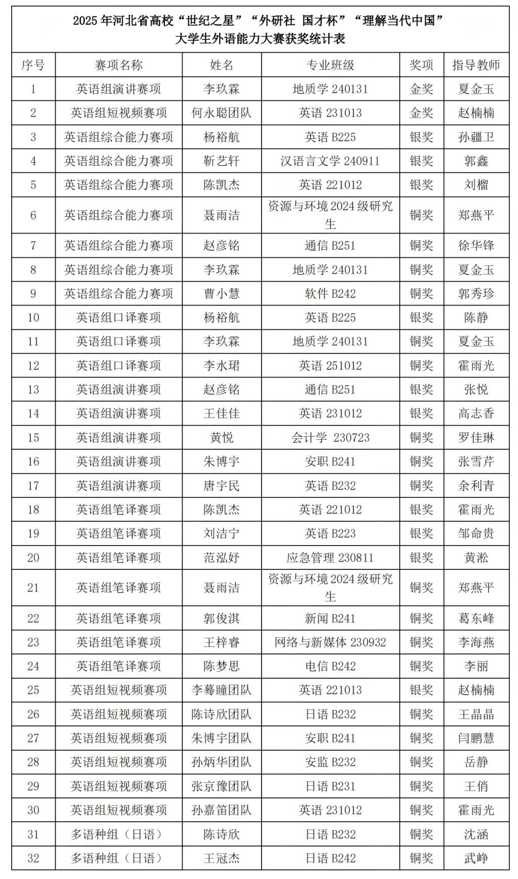 近日,2025年河北省高等学校“世纪之星”“外研社·国才杯”“理解当代中国”全国大学生外语能力大赛河北赛区系列赛事的决赛落下帷幕。beat365学子表现亮眼,共斩获省级金奖2项、银奖10项、铜奖20项,其中地球科学与工程学院的李玖霖、外国语学院的何永聪团队分别摘得英语演讲、英语短视频赛项金奖,成功晋级国赛。