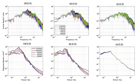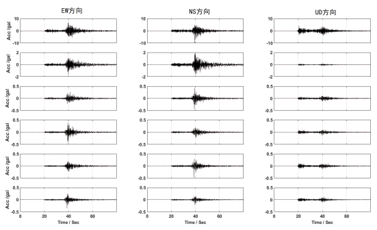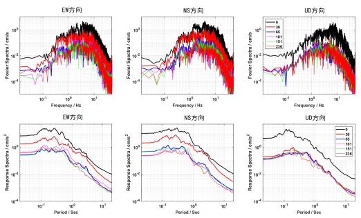 2020年7月12日北京时间06:38:25,河北省唐山市古冶区(北纬39.78度,东经118.44度)发生震源深度为10公里的5.1级地震,地震造成当地震感强烈,天津、北京等地震感明显,燕郊地区有明显震感,并触发SMASS台阵(震中距约143公里)的强震动观测设备,六个场地测点(地表、地下30米、65米、101米、151米、236米)和5个结构测点都获得了同步的EW、NS和UD各分向加速度记录,其中地表测点EW向、NS向和UD向峰值分别为6.7、9.9和4.2gal(具体加速度时程、傅里叶谱和反应谱如图1、图2),五楼顶面结构最大反应EW向、NS向和UD向峰值分别为19.2、11.9和4.6gal(具体加速度时程、傅里叶谱和反应谱如图3、图4)。此批强震动观测记录,为SMASS继2019年12月5日4.5级丰南地震后,再次获得完整的场地和结构强震动观测记录,进一步表明了该台阵观测功能的有效性。