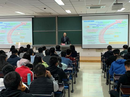 刘财教授首先为大家介绍了吉林大学地球探测科学与技术学院的基本情况,并欢迎学生报考该研究生。刘教授结合自身多年的科研及教学工作,以“地球物理信息对盆地油气的新认识”为例,为大家揭示了地球物理探测技术在对地球及地质过程认识中的重要作用,刘教授用幽默风趣的语言、生动形象的类比、深入浅出的讲解,让大家切实体会到了地球物理学科魅力。报告会上刘财教授还积极与到场师生互动,耐心解答相关问题,并在地球物理和勘查技术与工程专业学习、科学素养培养等方面给予了学生一系列有益的建议。