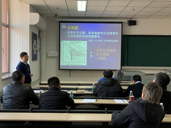 何宏林研究员从地震危险性预测、防震减灾与地震预测、重大工程地震安全性评价等几个方面详细介绍了古地震研究的意义、方法、研究现状及存在不足,并重点介绍了基岩区古地震研究的前沿,以霍山山前断裂和罗云山断裂为例生动阐释了地表同震位移和宇成核素测年两种方法在基岩区古地震研究中的应用。会后,何宏林研究员与在场师生就科学前沿问题进行了交流与探讨。