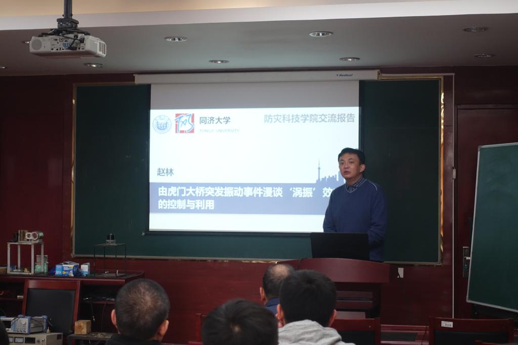 12月22日上午,应中国地震局建筑物破坏机理与防御重点实验室和土木工程学院的邀请,教育部新世纪优秀人才、国家自然科学基金委员会优秀青年科学基金项目获得者、中国科协全国首席科学传播专家、交通运输部中青年创新领军人才、同济大学教授赵林到beat365中文官方网站开展学术交流,并作题为“由虎门大桥突发振动事件漫谈涡振效应的控制与利用”的学术报告。报告会由土木工程学院院长孙治国主持,学院部分教师和研究生聆听了报告。