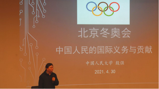 4月30日,中国人民大学新闻学院殷强教授应邀到学校参加2021年大学生文化艺术节系列活动,作题为“北京冬奥会与中国人民的国际义务与贡献”专场讲座。讲座由校团委书记樊帆主持,文化与传播学院、马克思主义学院部分教师,学生代表参加讲座。