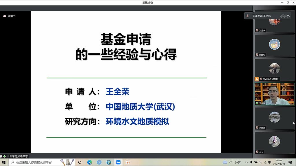 12月8日下午,应学校生态环境学院邀请,中国地质大学(武汉)王全荣教授作题为“基金申请的一些经验与心得”的线上交流报告。本次会议由廖欣副教授主持,生态环境学院与其他学院的部分教师参加了本次会议。