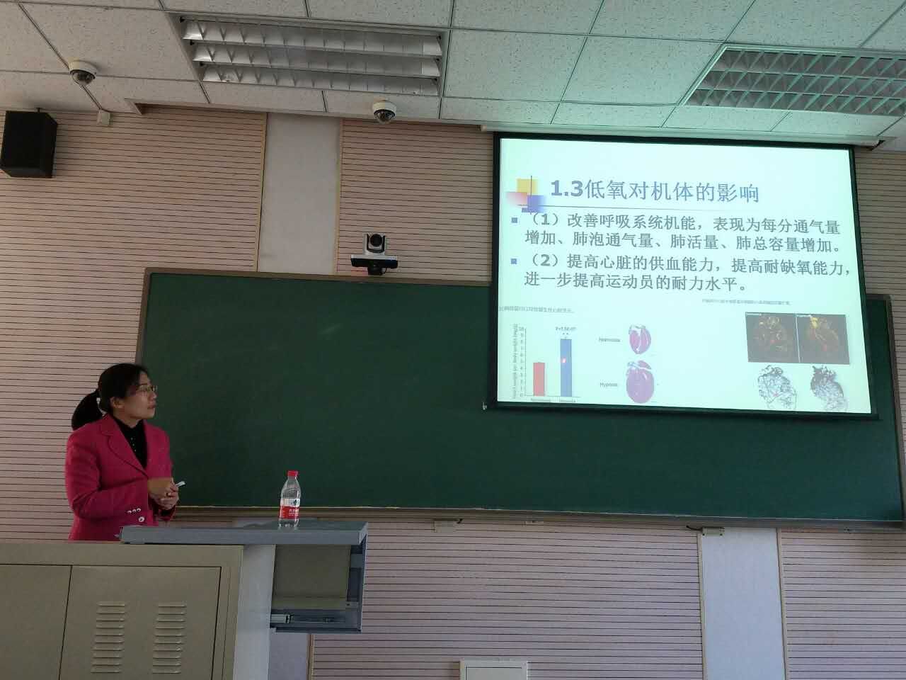 刘玉倩教授以“低氧对机体铁代谢的影响”为题,从低氧在体育科学中的应用、低氧在预防运动性低血色素中对机体铁代谢的影响、低氧研究中常用生理生化指标的检测方法等三个方面进行了讲解,让与会老师们了解了低氧训练在平时教学训练中的应用及科研方法,大家受益匪浅。