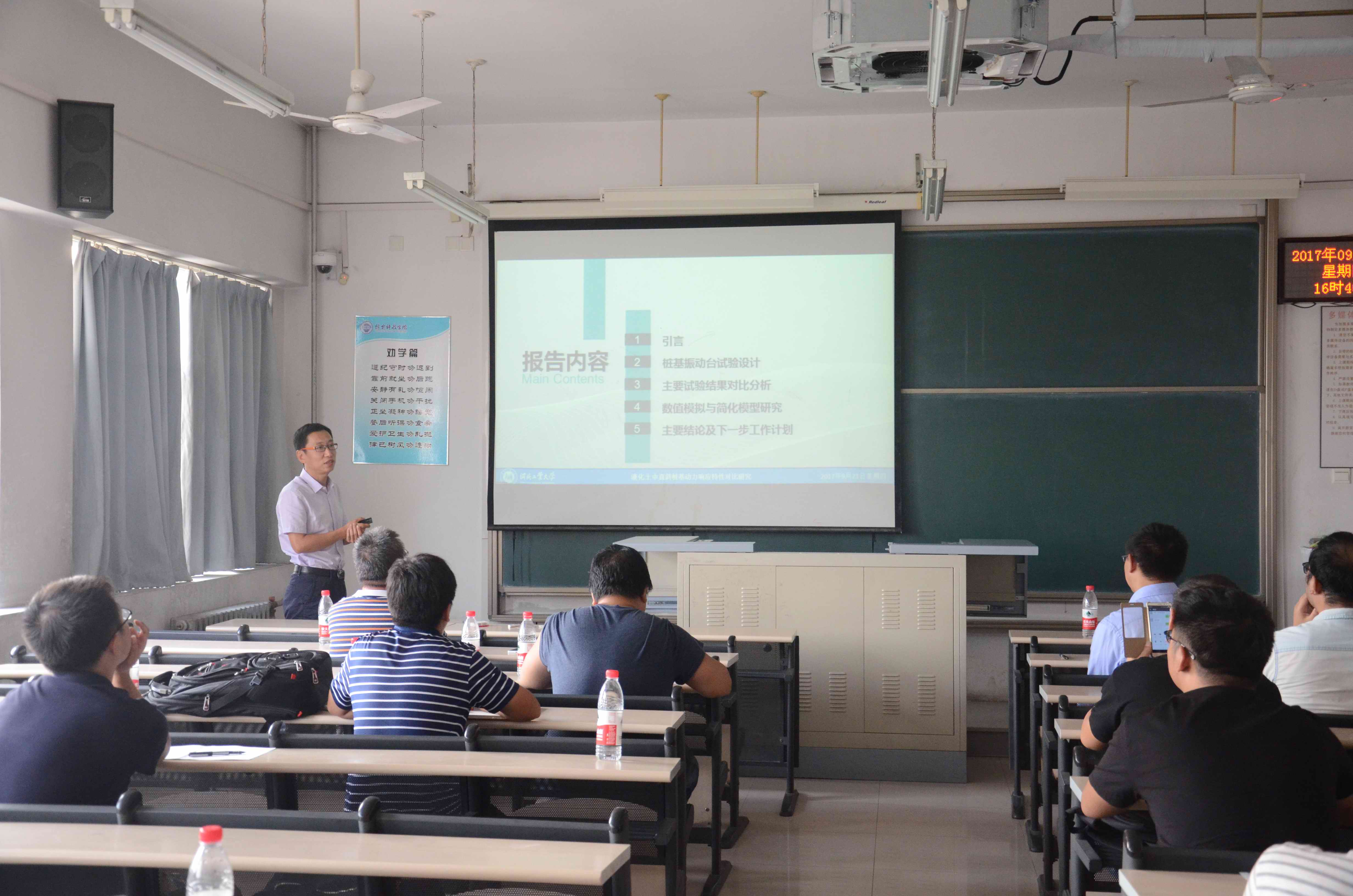 李雨润教授的报告题目为“液化土中直斜桩基动力响应特性对比研究”。报告以历次地震中桩基的震害为背景,介绍了其课题组完成的相关桩基振动台试验及数值分析结果。
