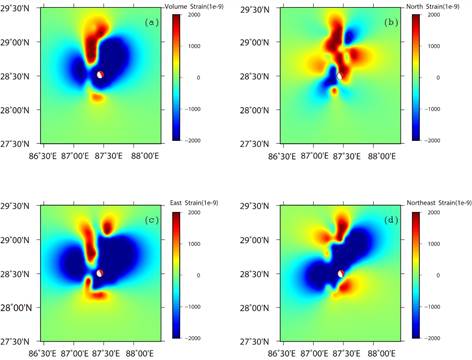 团队基于USGS网站提供的破裂模型,运用弹性半空间模型计算了西藏定日县6.8级地震在周围地区产生的地表同震位移场、面应变、体应变、北向应变、东向应变和北东向应变。这些研究成果有助于深入理解地震对周边地区的地质构造影响,为地震灾害评估和应急救援决策提供科学依据。