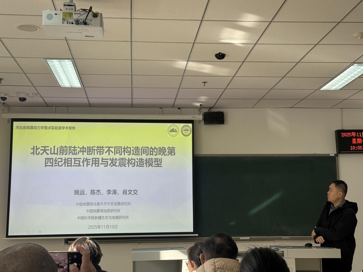 姚远研究员长期从事天山前陆冲断带变形特征、深浅耦合和强震孕育等方面的研究。本次报告,他详细介绍了近年来在北天山地区新发现的一些断裂几何展布和活动特征,并结合深部石油剖面,分析了断裂的形成机制,在此基础上重新构建了北天山地区的深浅耦合关系和强震孕育模型,以及断裂活动对地貌演化的控制作用,并讨论了不同构造带之间侧向生长特征以及可能存在的级联破裂关系。最后,姚远研究员还与大家进行了讨论交流,就天山地区活动构造研究现状以及存在的科学问题进行了总结。