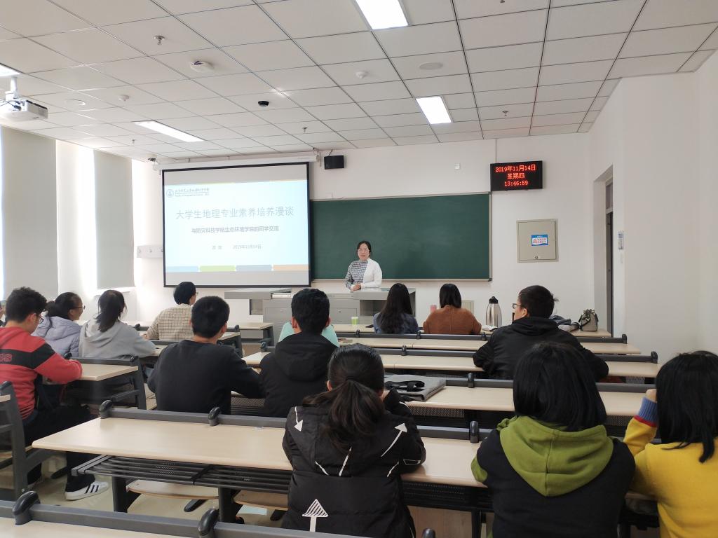 11月14日下午,北京师范大学苏筠教授应邀作题为“大学生地理专业素养培养漫谈”的学术报告,生态环境学院地理科学专业教研室老师以及大三学生参加了此次报告会,报告会由地理科学专业教研室主任石云副教授主持。