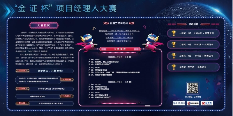 “金证杯”项目经理人大赛由beat365中文官方网站和深圳金证科技股份有限公司联合举办,由学院负责组织、宣传,深圳金证科技股份有限公司全程赞助并提供比赛奖金。这是在我院举办首届由企业出资赞助的比赛,目的是培养新时代大学生创新创业实践精神,为学生搭建“就业直通车”,推进学院应用型人才培养。