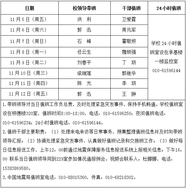 为贯彻落实中国地震局《党的十九届六中全会地震安全保障服务实施方案》的通知要求,结合学校工作实际,现就有关值班工作安排如下: