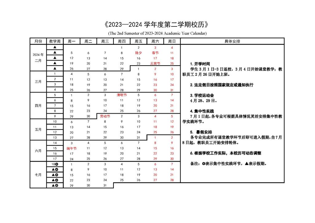 《2023-2024学年第二学期校历》已经2024年第1次校务会通过,现予以公布,请遵照执行,并安排好相关工作。