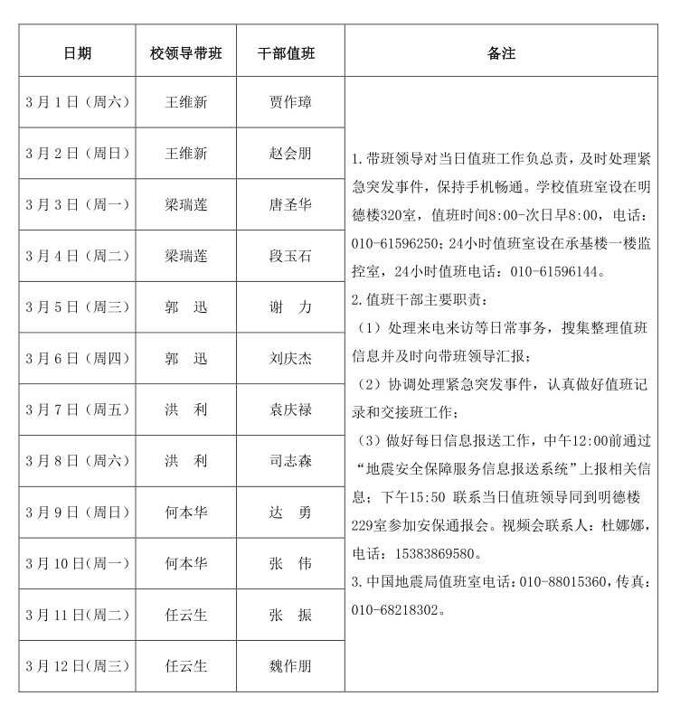 为贯彻落实中国地震局《2025年全国两会地震安全保障服务实施方案》的通知要求,地震安保时段为3月1日至2025年全国两会闭幕后1天,现预排值班工作如下: