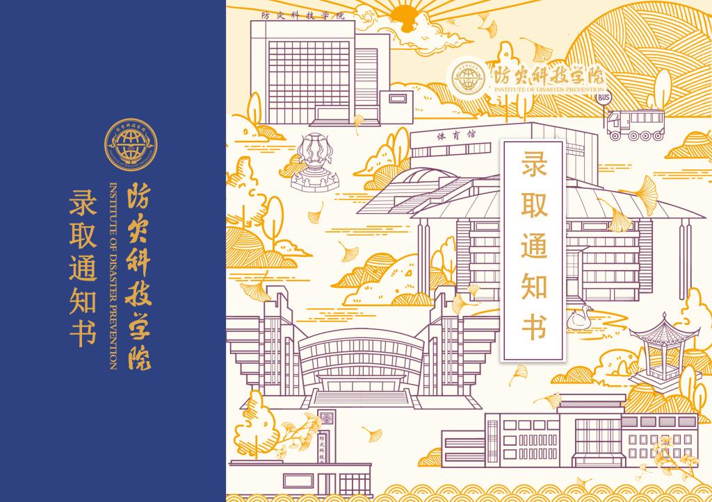 对于即将进入大学的同学而言,这个画面将会融入到未来四年的大学生活中,他们将会穿行于此,成为画面中的动态元素;同时,新的画面也承载着新生们对未来的一份期待与憧憬,当他们毕业后,再次回眸校园,这些熟悉的一楼一景、一草一木都将会拉开大学生活回忆的帷幕,心中的万千感慨也将被此画面唤起。画面建筑物采精细的线条绘制,体现学校办学严谨、精良的态度,颜色采用中国色中的暗玉紫,以体现大学深厚的文化底蕴;校园景观采用橙黄色,既包含新生拿到录取通知书时的光明未来,也包含着毕业时丰硕的收获,同时与遍布校园银杏叶遥相呼应,渲染出朝气蓬勃、充满活力校园氛围;背景底色为学校标准色低明度的防灾蓝,文字为高纯度的金色,以体现严谨理性的学校平台和充满活力的青年学子。