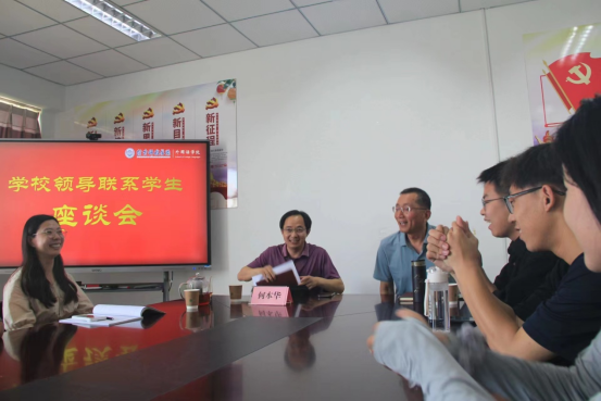 6月15日下午,联合党委常委何本华与所联系班级221011班全体学生开展座谈交流。座谈会由外国语学院党总支书记王建富主持。