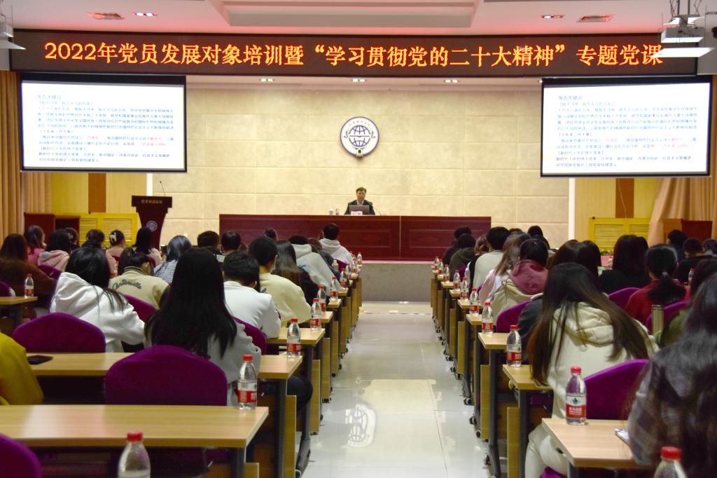 为深入学习宣传贯彻党的二十大精神,教育引导预备党员、党员发展对象坚定理想信念,提高政治素质,学校党委党校专门举办预备党员与党员发展对象培训班。10月27日,培训班开班式在明德楼328举行,主持学校党委工作副书记石峰出席并以“自信自强 沿着中国式现代化道路阔步向前”为题,为培训班专门讲“学习贯彻党的二十大精神”专题党课。