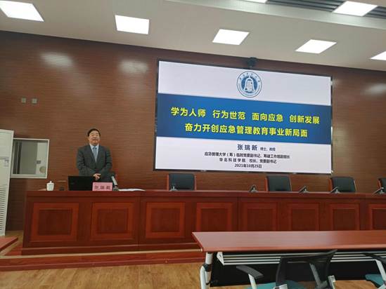 培训期间,应急管理大学(筹)临时党委副书记、应急管理大学筹建工作组副组长、华北科技学院校长张瑞新为新教师作题为《学为人师行为世范面向应急创新发展奋力开创应急管理教育事业新局面》的开班报告。张瑞新深入分析了新时代高等教育改革发展形势和新时代应急管理专业人才培养需求,详细讲解了应急管理大学学科专业建设和人才培养规划;要求新教师要找准服务面向、深化转型发展,积极参与特色专业、一流课程建设,稳步提升业务素质,奋力投身应急管理大学筹建事业。张瑞新勉励新教师要学为人师、行为世范,努力成长为教学与科研兼顾、教书与育人兼顾、信道与传道兼顾、立己德与树人德兼顾的好老师。