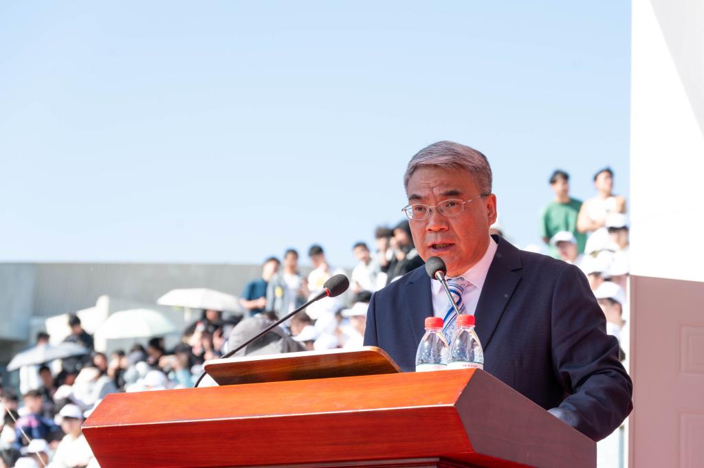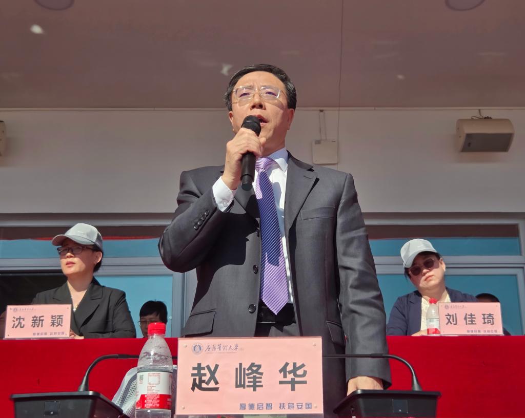 赵峰华宣布2025年校春季田径运动会开幕。任云生致开幕词,指出此次运动会师生以融合后的二级机构组队参赛,全校师生同场竞技,代表两校融合工作进一步走深走实。2025年,是学校“十四五”规划的收官之年,也是全力冲刺大学去筹挂牌的决胜之年。此次运动会的举办不仅是对学校体育竞技水平和群众性体育工作成果的一次大检阅,更是全校师生良好精神风貌的一次全面展示。号召全体师生以此次盛会为契机,顽强拼搏、奋勇争先,将积蓄的力量、锤炼的意志、集聚的气势转化为实现大学去筹挂牌、高质量内涵建设和跨越式发展的澎湃动力,为教育强国、体育强国和健康中国建设作出应大人新的更大贡献。