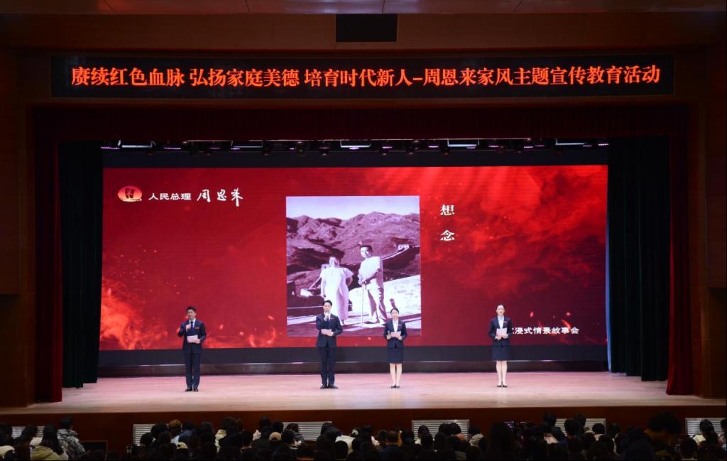 10时在学校礼堂举办《人民总理周恩来》沉浸式情景故事会。本次故事会由周恩来纪念馆“海棠花”党支部讲解员倾情演绎。演员们通过情景讲述、微纪录片、散文诗朗诵、演唱等方式,将《我认的主义一定是不变了》《危局中的擎炬者——周恩来与西安事变和平解决》《西花厅不灭的灯光》《最美的情书》等八个故事再现出来。生动的演绎让在场师生仿佛穿越时空,真切感受到周恩来理想信念的确立、危机中斡旋、中华人民共和国成立后心系人民以及与邓颖超的革命爱情故事,深刻理解了红色家风的精神内核。